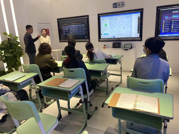 科大讯飞公司是国内领先的人工智能技术企业,拥有世界领先的语音技术和人工智能技术,广泛应用于教育、医疗、交通等领域。在人工智能云展厅,工作人员展示了智慧黑板、智能评卷系统、选课监测数据系统等新技术在实际教育教学场景中的实践应用。老师们在参观时不断互动提问,不仅加深了对科技深度融入教育的认识,也对人工智能助力教育高质量发展表示出浓厚兴趣。老师们体验了能实现中英文语音转文字、中英互译、会议记录快速成稿的“讯飞听见智能会议系统”;使用了语音识别、手写识别、说话人识别等核心技术的“讯飞智能办公本”等多种人工智能高端前沿产品,了解了人工智能在办公、教育、医疗、城市管理等领域的应用。