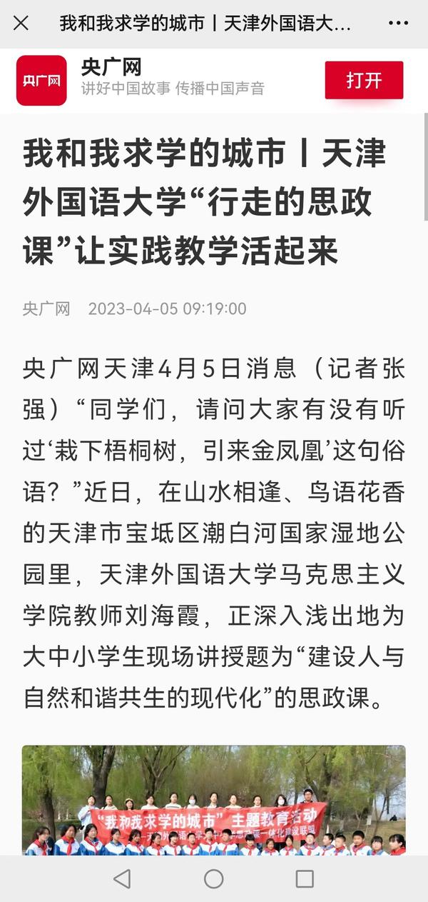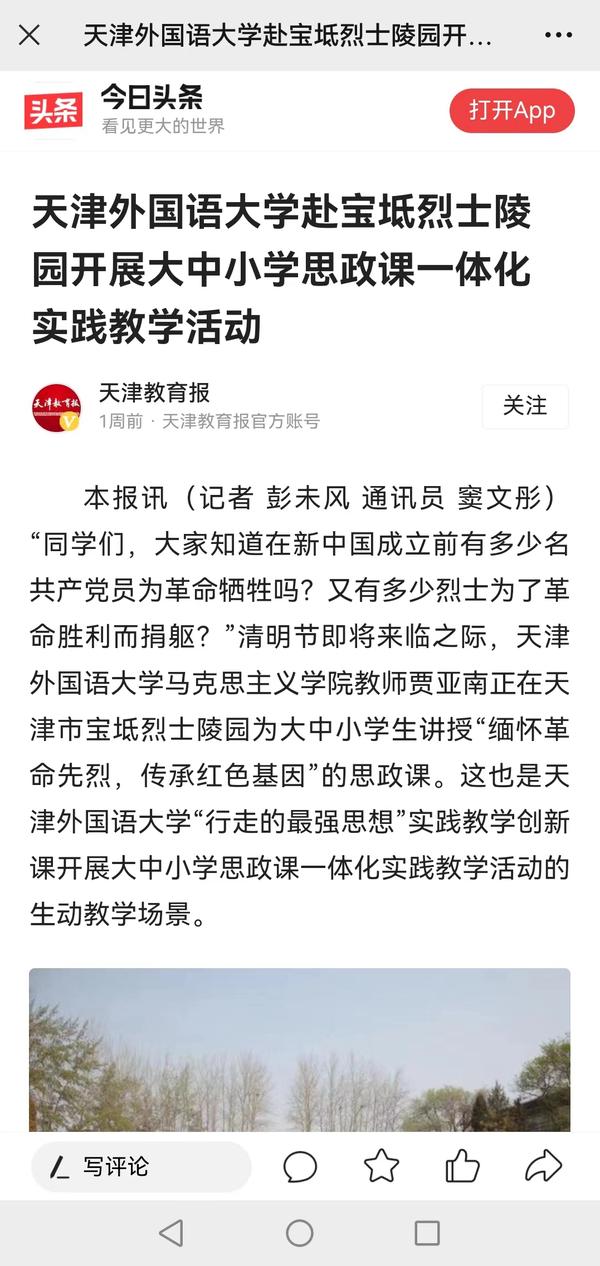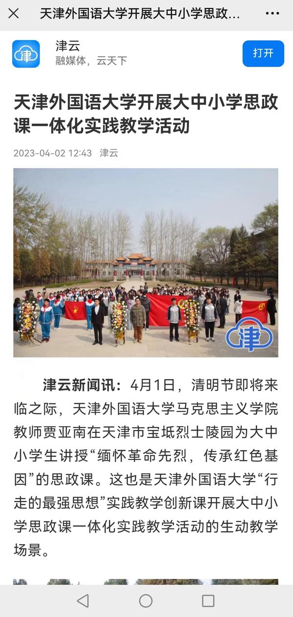 4月1日,清明节即将到来之际,开云手机平台_开云(中国)马克思主义学院教师贾亚南在宝坻区烈士陵园为大中小学学生开展“缅怀革命先烈 传承红色基因”思政课。这也是开云手机平台_开云(中国)“行走的最强思想”实践教学创新课开展大中小学思政课一体化实践教学活动创设的教学情景。中国日报网、央广网、天津日报、津云、天津教育报、宝坻新闻等多家媒体对此进行了报道。