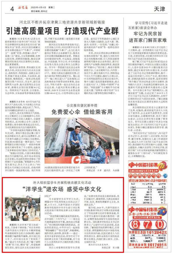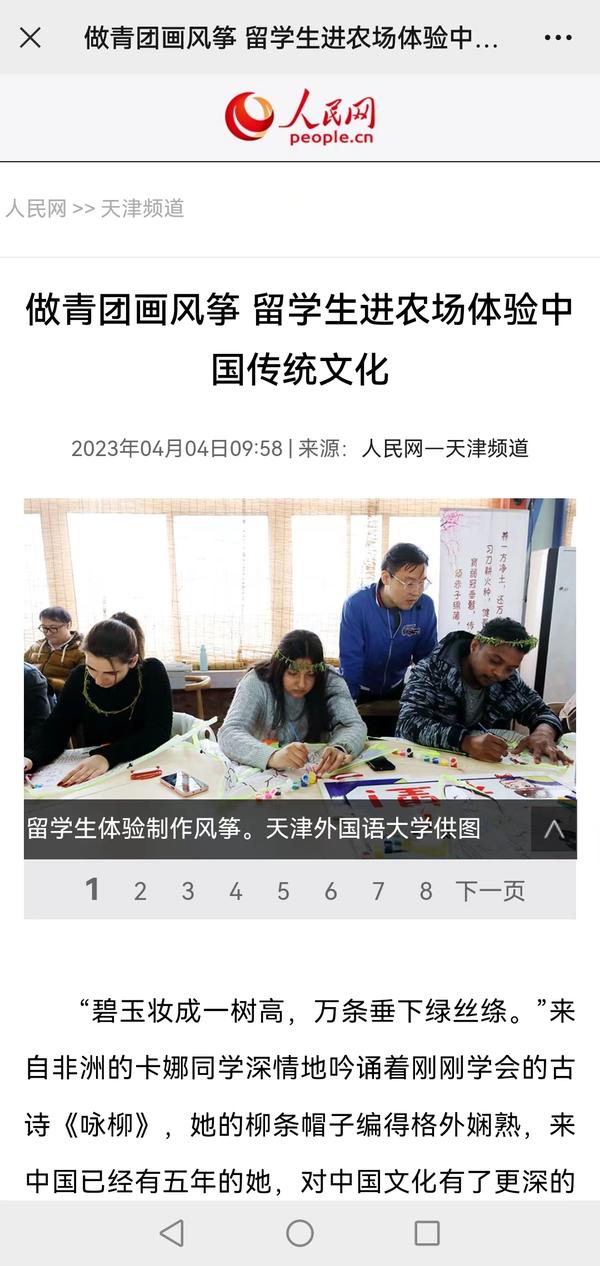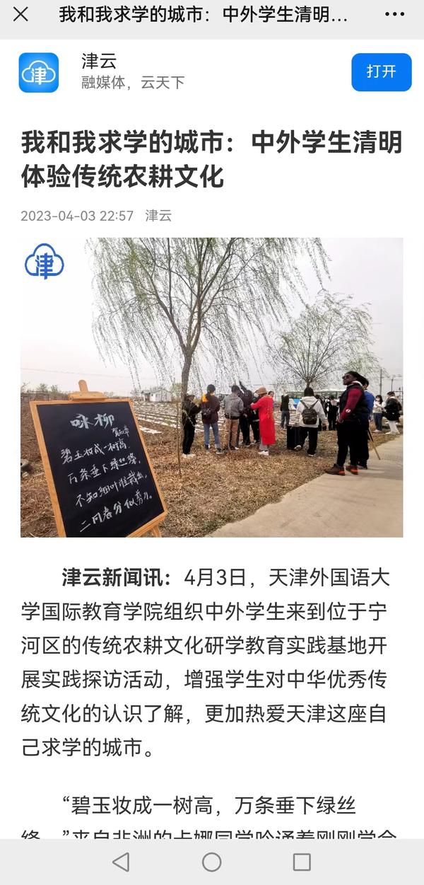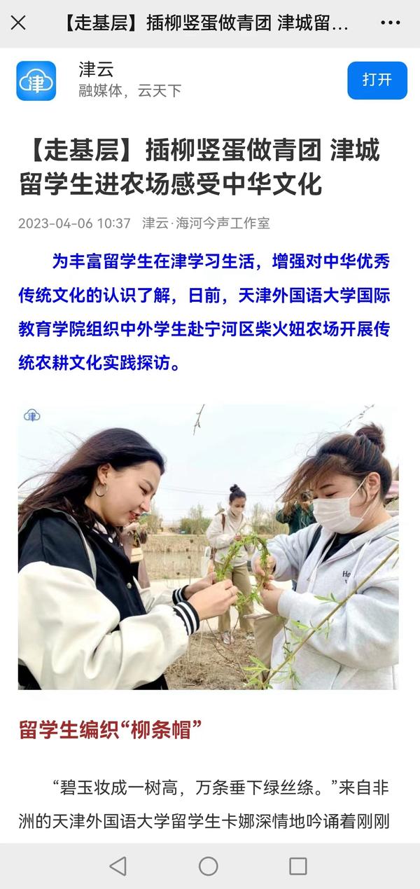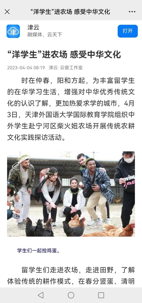 为丰富留学生的在华学习生活,增强对中华优秀传统文化的认识了解,更加热爱求学的城市,4月3日,开云手机平台_开云(中国)国际教育学院组织中外学生赴宁河区柴火妞农场开展传统农耕文化实践探访活动。人民网、新华社客户端、中国日报网、天津卫视《泊客中国》栏目、天津日报、津云、今晚报、宁河融媒体等多家媒体对此进行了报道。