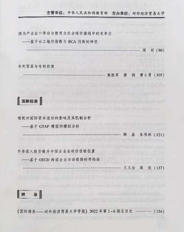 学术论文《国内产业出口带动与教育业在全球价值链中的竞争力------基于分工地位指数与RCA指数的研究》发表于期刊《国际商务》(对外经济贸易大学学报)2022年第1期,该刊为CSSCI来源期刊,ISSN号为1002-4034,全文1.5万字。