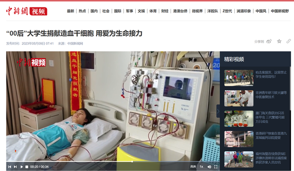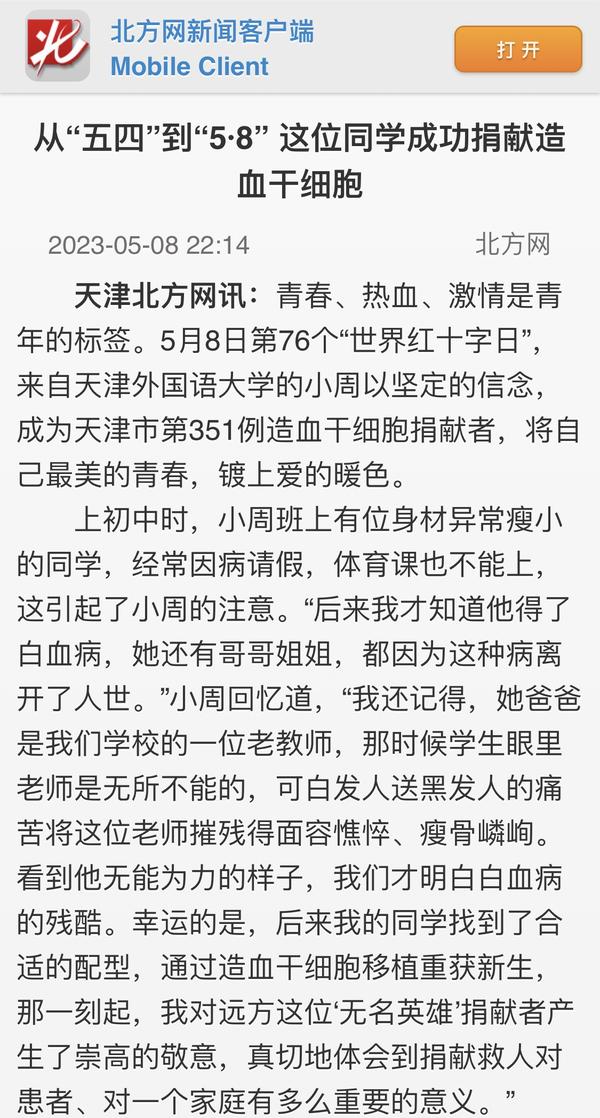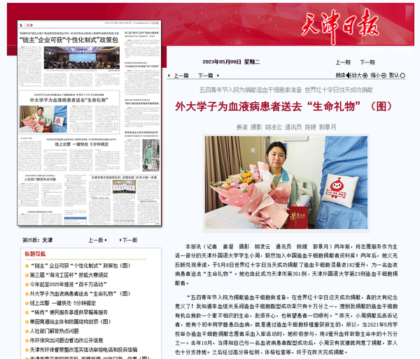五四青年节入院为捐献造血干细胞做准备,五八世界红十字日当天成功捐献,这是一场富有纪念意义的爱心接力。人民日报、中国新闻网、天津日报、天津电视台、北方网、天津市红十字会、天津市红十字事务中心等媒体对此进行了报道。