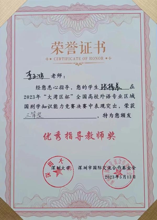 5月13日,2023年“大湾区杯”全国高校外语专业区域国别知识能力竞赛在深圳大学(粤海校区)落下帷幕。我校2020级本科生张楊晨、2022级硕士研究生何星宜分别荣获英语组三等奖、德语组三等奖,英语学院李正鸿老师、欧洲语言文化学院胡峰老师荣获优秀指导教师奖。