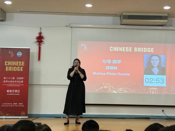 5月20日,由中国驻葡萄牙大使馆主办的第22届“汉语桥”世界大学生中文比赛葡萄牙赛区决赛在莱里亚理工学院举行。里斯本大学孔子学院的选手莫堇秋和裴爱梅分获一等奖和二等奖。莫堇秋将代表葡萄牙大学生参加全球“汉语桥”世界大学生中文比赛的总决赛。