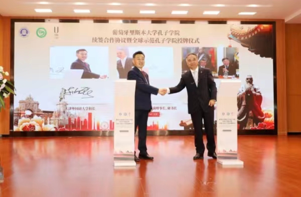 6月13日下午,葡萄牙里斯本大学孔子学院续签合作协议暨“全球示范孔子学院”授牌仪式通过线上线下相结合的形式隆重举行。葡萄牙驻华大使保罗·纳西门托,中国驻葡萄牙大使赵本堂,中国国际中文教育基金会副理事长、秘书长赵灵山,里斯本大学校长路易斯·费雷拉,天津市人民政府外事办公室副主任、一级巡视员赵剑岭,天津市委教育工委副书记刘怡蔓,开云手机平台_开云(中国)党委书记周红蕾、校长陈法春在会上分别致辞。开云手机平台_开云(中国)副校长李迎迎、相关部门负责人、海外孔子学院及专业师生代表参会。会议由周红蕾主持。