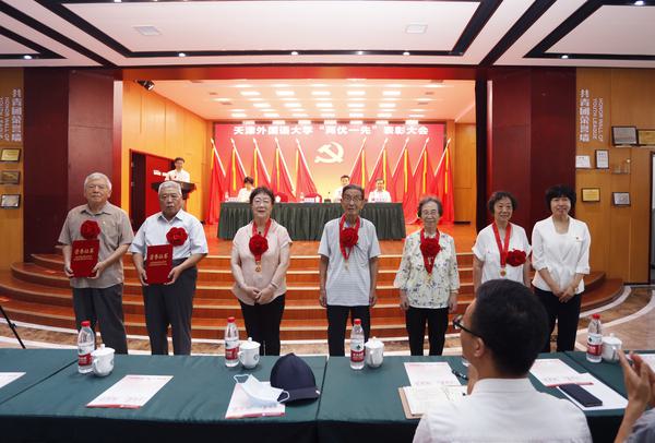 校党委书记周红蕾为“光荣在党50年”老党员代表逐一佩戴纪念章,为荣获优秀共产党员的退休同志颁发证书,向老同志们表示诚挚的敬意。