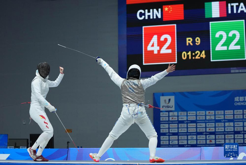 当日,在成都举行的第31届世界大学生夏季运动会击剑女子花剑团体金牌赛中,中国队以45比22战胜意大利队,获得金牌。