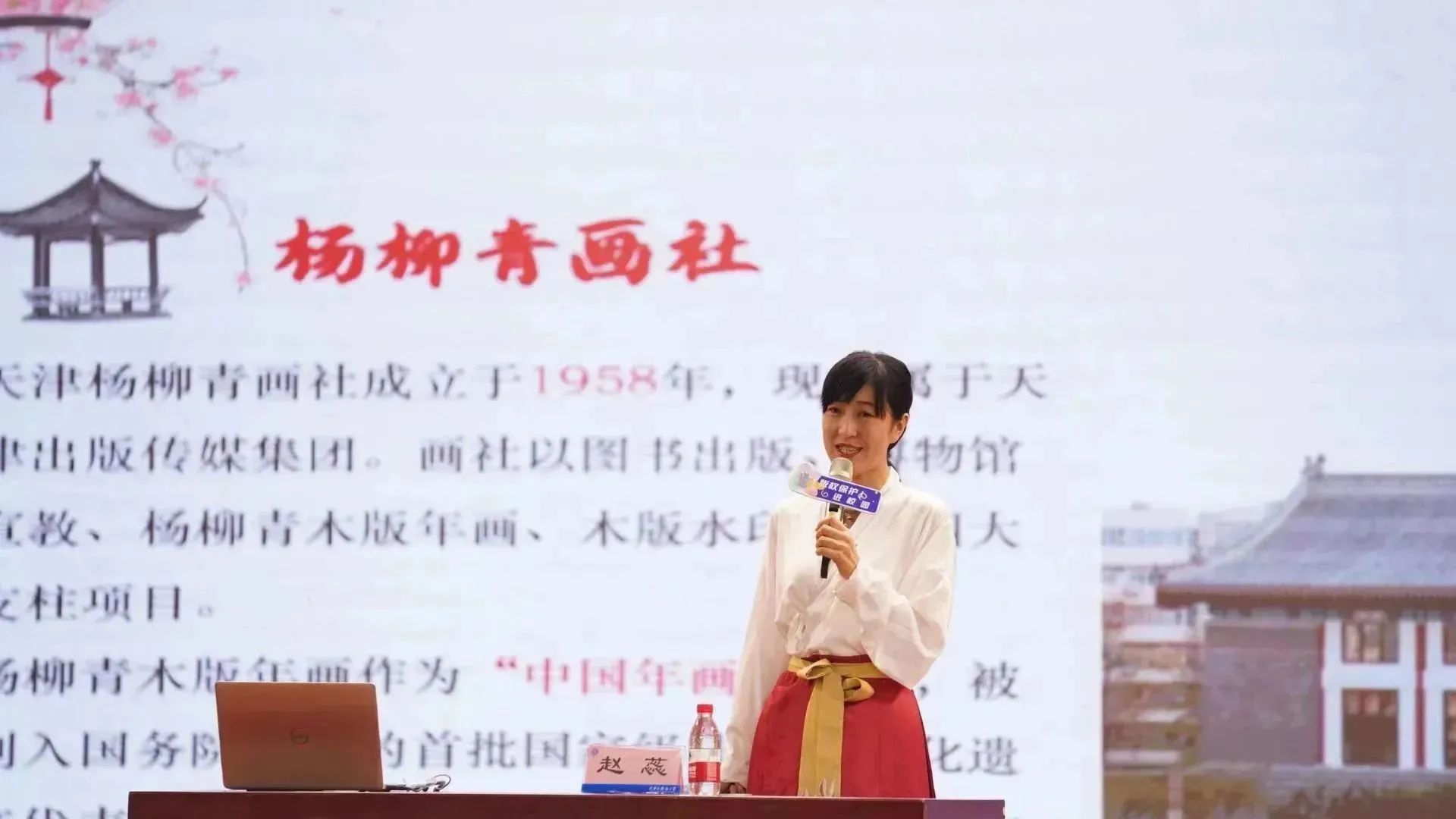 活动中,天津杨柳青木版年画博物馆馆员、研学老师赵蕊带来了“版权保护工作与非遗保护宣传工作中合理开发应用”的分享。杨柳青年画兼容南方画派的细腻与院体宫廷画风的恢弘,帮助学生提高文化艺术审美综合素养,让青年学子在科学、文化与艺术的碰撞中思考版权保护对非遗文化的重要性。