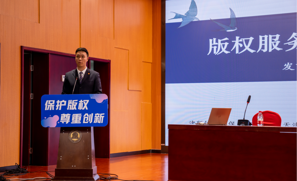 版权服务站负责人郭明月对版权服务站相关工作进行了简单介绍。版权服务站志愿者骨干王啟樊在发言时说道:“我们将积极发挥作用,了解师生们在版权保护方面的疑问和需求,与天津出版国际文化发展有限公司携手为全校师生提供版权咨询、著作权登记确权、侵权监测、盗版维权、IP转化运营等版权公益服务。”