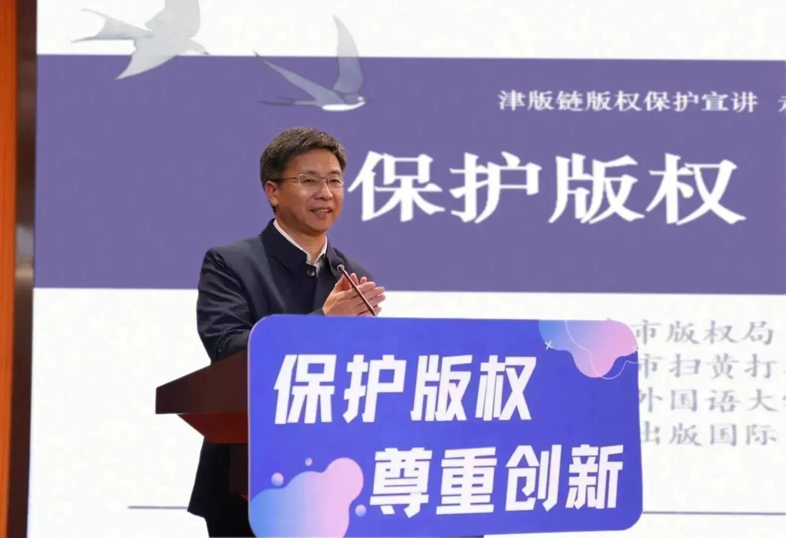 市委宣传部版权管理处处长李文卫在致辞中同样强调了在学校开展版权宣传教育的重要性,他提到:“版权保护是维护作者权益、激发创新创造的重要保障,也是国家知识产权战略的重要组成部分。希望大家能够积极参与到版权保护工作中来,为推动文化事业的繁荣和发展做出更大贡献。”