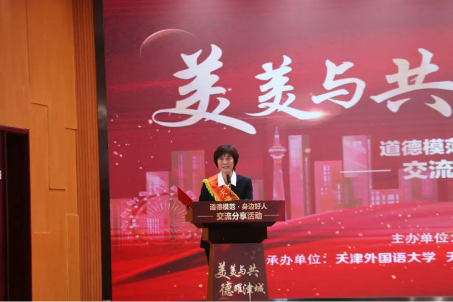 随后,中国好人、第七届天津市道德模范、五大道义务讲解员张振东,第八届天津市道德模范、天津好人、市司法局法律援助中心退休干部马芳菲,第八届天津市道德模范、天津好人、天津市人体器官捐献志愿服务队副大队长邢蕴静,第八届天津市道德模范、天津好人王智萍依次上台,与师生们分享了他们“讲述五大道的历史”“用‘小快板儿’宣讲‘大道理’”“当好‘生命摆渡人’”“做失明儿子心中‘灯塔’”的故事,触动着现场每个人的心。