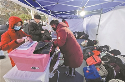 在中国传媒大学,考场教学楼前支起几十个帐篷,每个帐篷上标记着考场号码,方便学生摆放书包时“对号入箱”,每个帐篷里还配备了专门的志愿者负责引导和服务,每名考生都有一个印着考场和座位号的贴纸,一式两份,考生取包时需要出示号码取走物品。