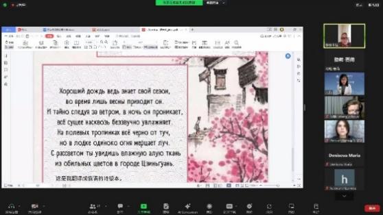结业式上,学员们紧扣“故事中国”主题展示了自己精心准备的作业。中级班的学员柳德米拉向任课教师孔艳表达了真挚的感谢之情,她朗诵了杜甫的古诗《春夜喜雨》,并将其翻译成了俄语。学员佳娜用中文讲述了普希金的童话《渔夫和金鱼的故事》,祝愿大家在新的一年愿望成真。