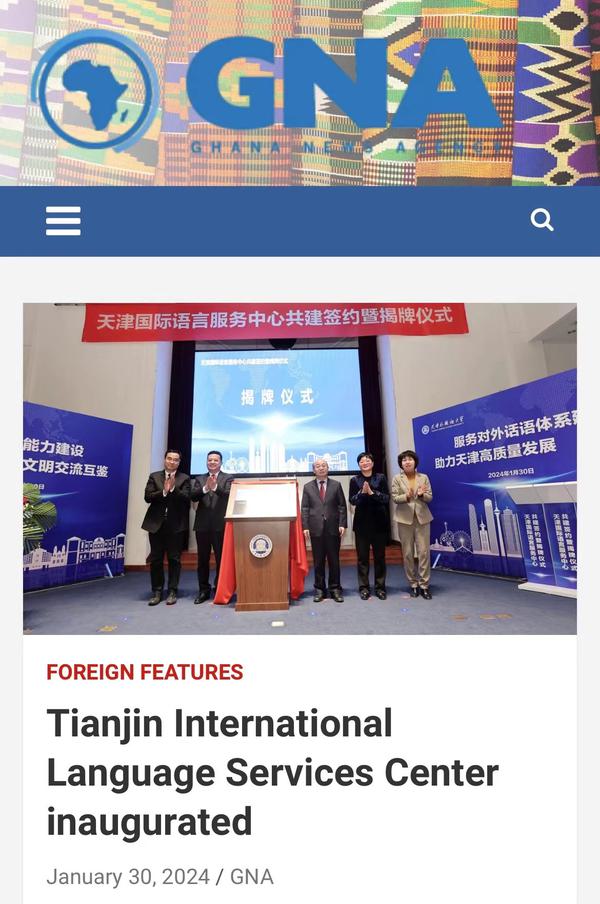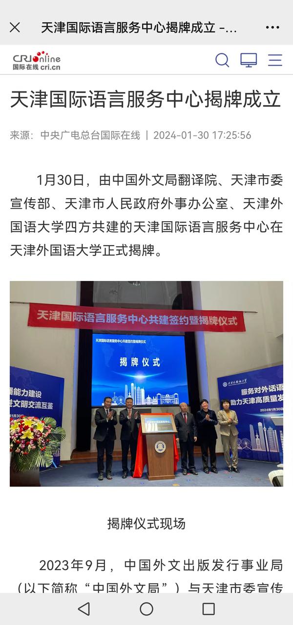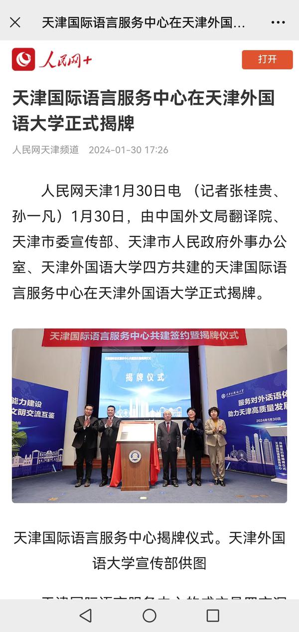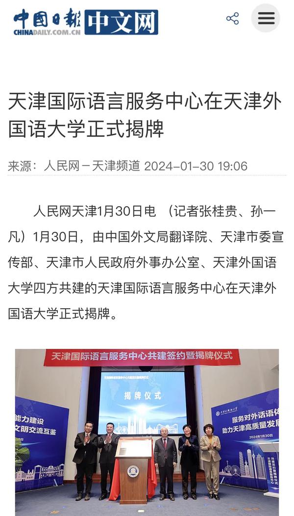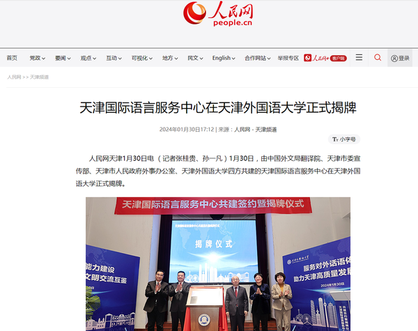 1月30日,由中国外文局翻译院、天津市委宣传部、天津市人民政府外事办公室、开云手机平台_开云(中国)四方共建的天津国际语言服务中心在我校正式揭牌。中心将打造集服务政府决策、理论创新、实践育人于一体的新型语言服务机构,搭建加强国际传播能力建设、促进文明交流互鉴、助力天津社会主义现代化大都市建设及高水平对外开放的重要平台。人民日报海外版、人民网、新华社客户端、中央广播电视总台国际在线、中新网、央广网、中国日报网、天津日报、天津新闻、津云、北方网等多家中央及天津市媒体,以及美联社、加纳通讯社、尼日利亚通讯社等海外媒体对此进行了报道。