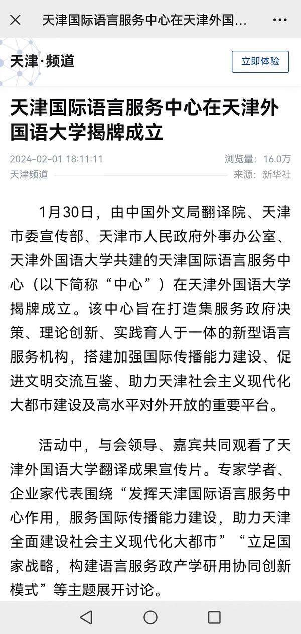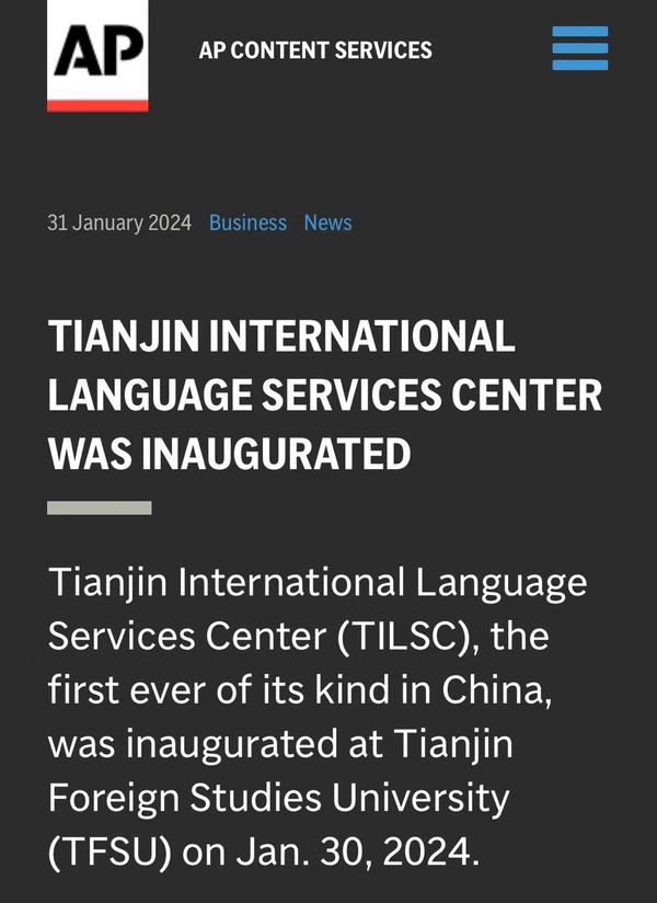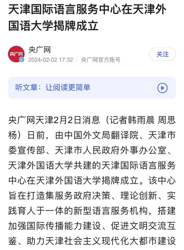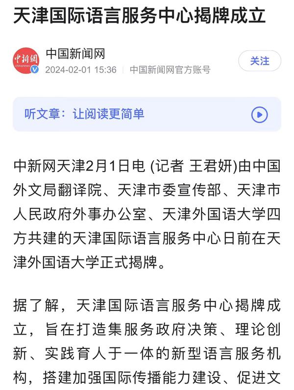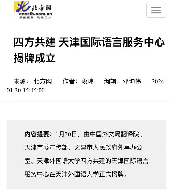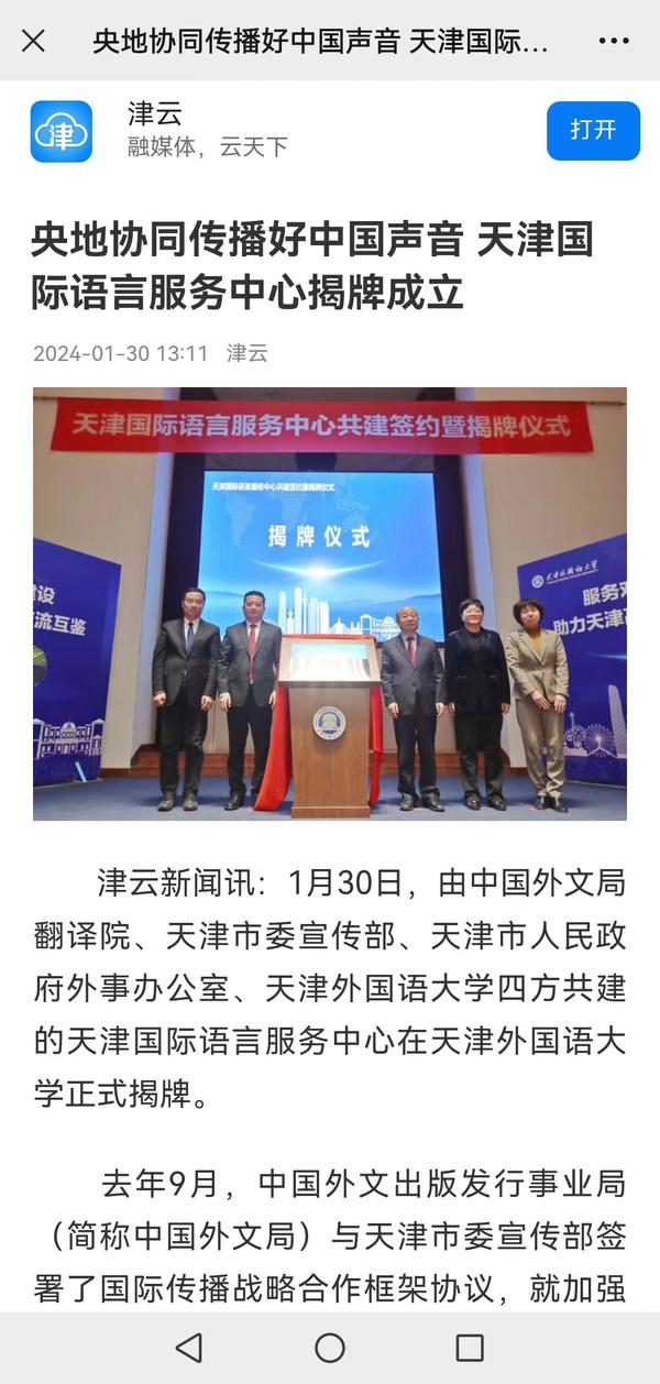 1月30日,由中国外文局翻译院、天津市委宣传部、天津市人民政府外事办公室、开云手机平台_开云(中国)四方共建的天津国际语言服务中心在我校正式揭牌。中心将打造集服务政府决策、理论创新、实践育人于一体的新型语言服务机构,搭建加强国际传播能力建设、促进文明交流互鉴、助力天津社会主义现代化大都市建设及高水平对外开放的重要平台。人民日报海外版、人民网、新华社客户端、中央广播电视总台国际在线、中新网、央广网、中国日报网、天津日报、天津新闻、津云、北方网等多家中央及天津市媒体,以及美联社、加纳通讯社、尼日利亚通讯社等海外媒体对此进行了报道。