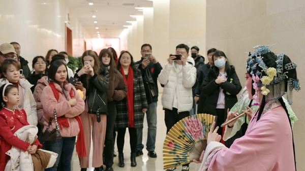 当天在展厅里,来自天津歌舞剧院的民乐演员们为外籍师生们带来了民乐表演《春江花月夜》,天津市曲艺团著名青年艺术家王鸿亮表演了单弦岔曲《风雨归舟》,天津市青年京剧团的演员们带来昆曲《牡丹亭》片段,委婉细腻、流丽悠长的唱腔,载歌载舞、衣袂飘飘的表演,典雅考究、华丽优美的唱词让师生们沉浸式体验了中国戏曲之美。现场的表演艺术家和非遗传承人们也表示,很高兴能为外籍师生们展示中华文化的博大精深,让他们感受独特的东方美学。