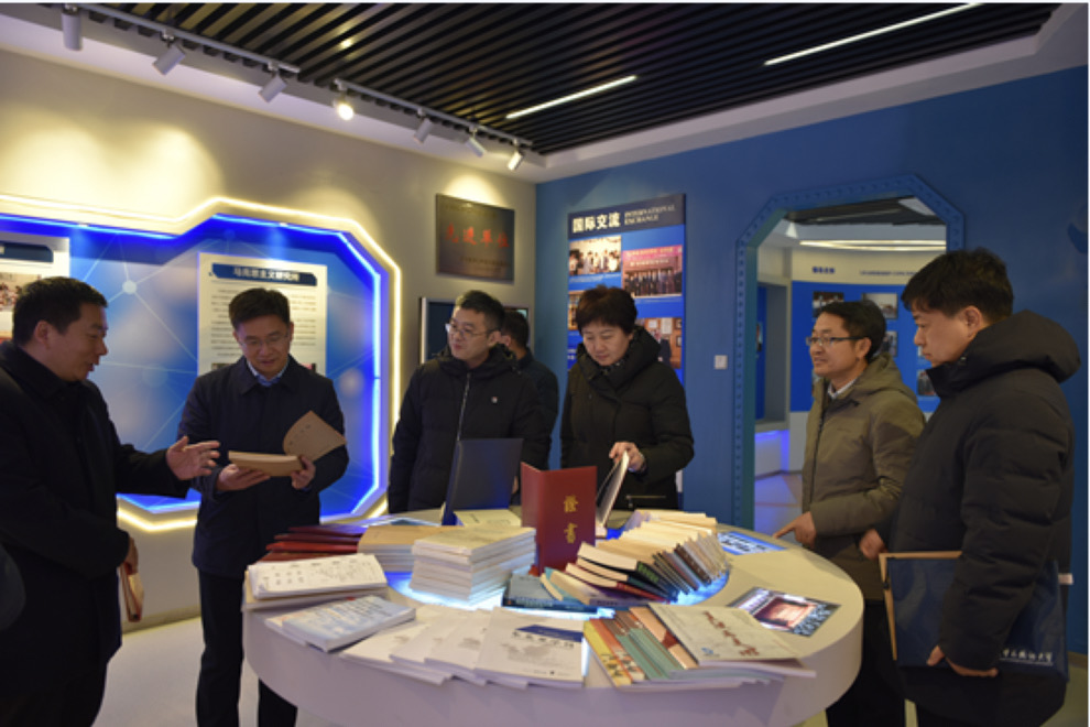 院科研组织处及11个相关研究所所长结合特色优势,就协同推进理论研究、思政一体化建设、智库建设等,谈了意见建议。调研组还参观了我院科研成果展。
