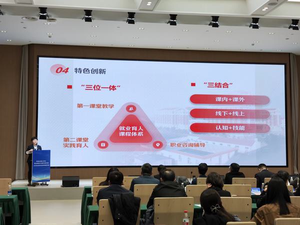 一直以来,学校高度重视就业课程建设,经过8年的打磨,目前已构成以第一课堂教学、第二课堂实践育人、职业咨询辅导“三位一体”的就业育人课程体系,初步形成基于体验式学习理念,“课内+课外”“线上+线下”“认知+技能”三结合的教学特色模式。