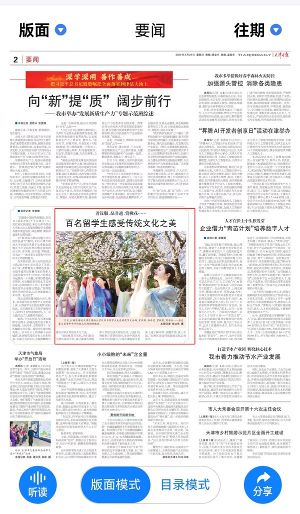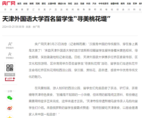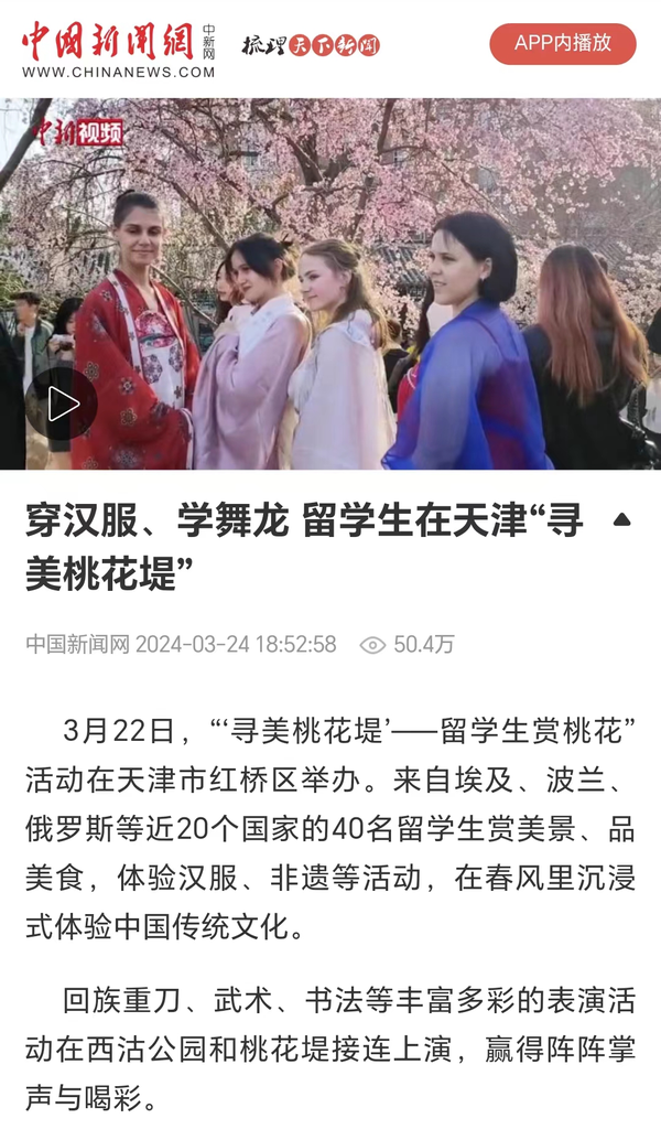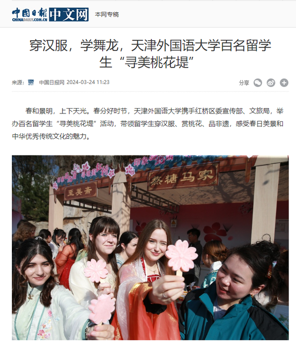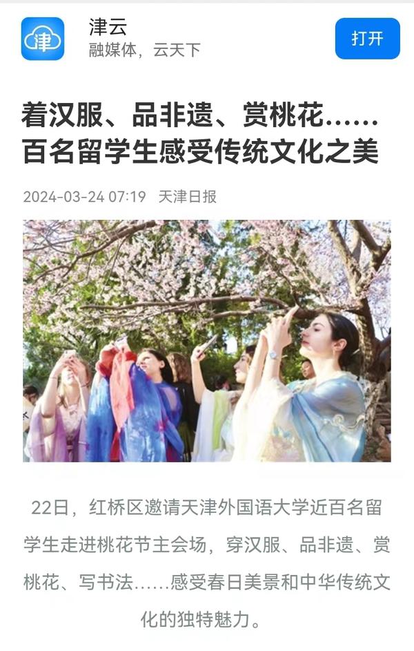 春分好时节,我校携手红桥区委宣传部、文旅局,举办百名留学生“寻美桃花堤”活动,带领留学生穿汉服、赏桃花、品非遗,感受春日美景和中华优秀传统文化的魅力。新华社客户端、中国新闻网、央广网、中国日报网、天津新闻频道-都市报道60分、“TJTV新闻频道”视频号、天津日报、津云、今晚报、“你好天津”视频号、“美丽红桥”视频号等多家媒体和单位对此进行了报道。