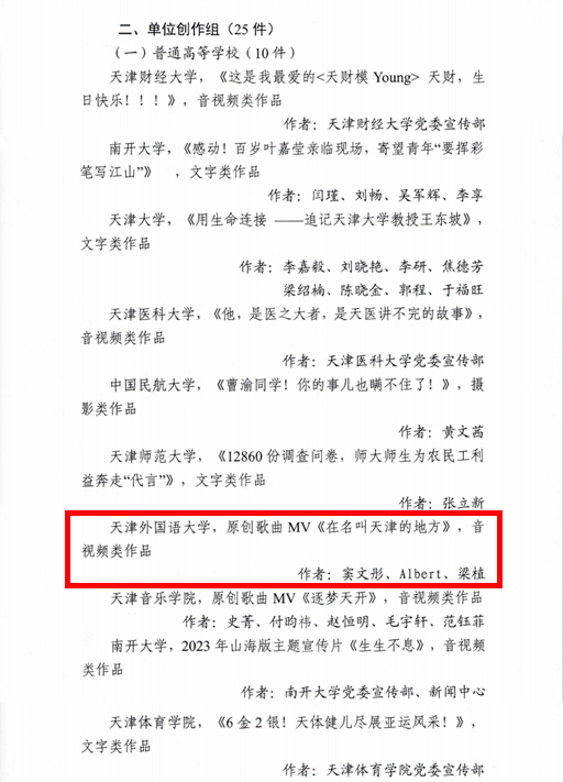 3月26日,由市教育两委组织开展的2023年度天津市“十大教育新闻作品”评选结果公布。经过自主申报、专家评审、网上公示,最终评选出普通高等学校新闻媒体组、单位创作组各10件作品。我校报送的由中国日报社天津记者站站长杨成撰写的《From Italy to China: One teacher's tale》入选新闻媒体组“十大教育新闻”;由党委宣传部策划制作,学校意大利语专业外籍教师Alberto作曲、天外学生记者团学生梁植作词的原创音视频作品《在名叫天津的地方》入选单位创作组“十大教育新闻”。