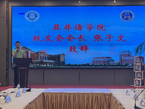张子文在讲话中对领导、老师和校友的信任与关怀表示感谢。他指出,亚非语学院伴随着学校的发展走过18载岁月,始终与时代同行、与社会共进,始终坚守为党育人、为国育才初心使命,在波澜壮阔中不断成长,在励精图治中不断创新。作为第二届校友会会长,他将和各位校友一同努力,秉承服务广大校友、服务亚非发展的宗旨,努力把校友会建设成为联络校友的桥梁、增进感情的纽带和服务校友的港湾。
