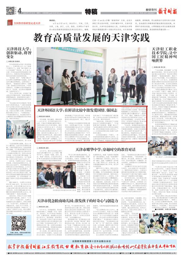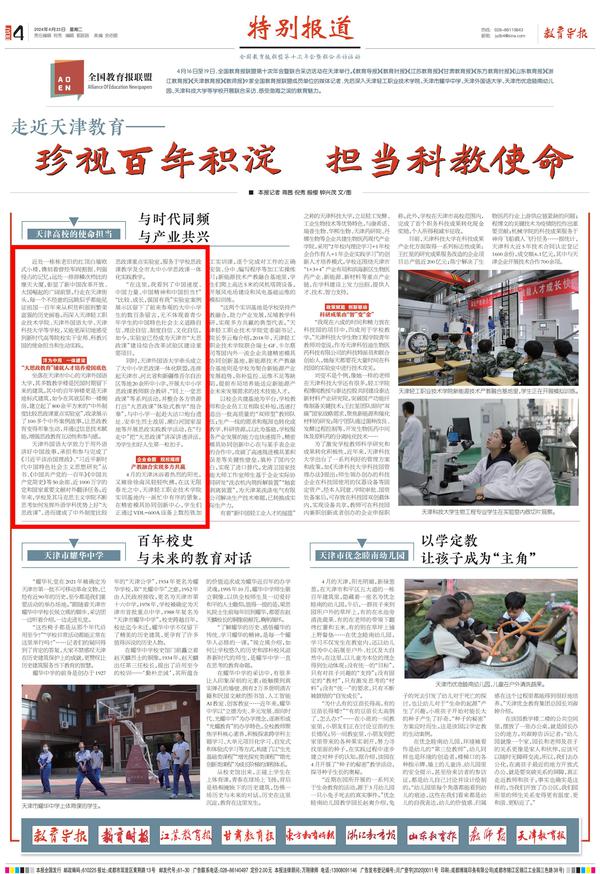 4月16日—19日,全国教育报联盟第十次年会暨联合采访活动在天津举行。《教育导报》《教育时报》《江苏教育报》《甘肃教育报》《东方教育时报》《山东教育报》《浙江教育报》《教师报》《天津教育报》的相关负责人、编辑、记者一行40余人,先后走进天津轻工职业技术学院、天津市耀华中学、开云手机平台_开云(中国)、天津优念睦南幼儿园、天津科技大学开展联合采访,了解天津市各级各类学校办学理念,感受天津教育发展脉搏。近日,上述媒体陆续对此次活动及相关院校进行了详细报道。