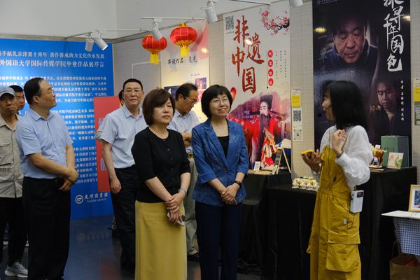 开幕式后,与会嘉宾一同参观了2024年国际传媒学院毕业作品展。校馆双方领导就开展科研合作、文创设计、志愿服务等多领域合作,建立文化、教育资源共享机制开展深入交流。