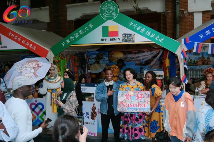 漫步在各个展位间,哥伦比亚的同学们热情地邀请游客们跳起昆比亚,尽显南美的热情奔放和舒畅欢愉;韩国同学用五颜六色的颜料打造的面部彩绘绚丽精致;日本同学和游客们一起折叠千纸鹤,寄予心想事成的美好愿望;贝宁的美食引得大家赞不绝口;哈萨克斯坦的传统服装试穿体验让人们仿佛置身广袤的大草原……琳琅满目的各国手工艺品、特色小吃,天津非遗文化体验区等彰显着不同的民族风情和文化内涵,吸引游客们倾听、体验。现场特设的天外本科生、研究生招生宣传展位和留学生招生宣传展位前人头攒动,不少市民前来咨询交流。