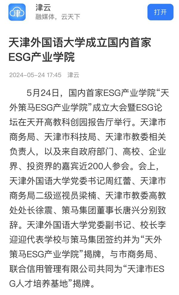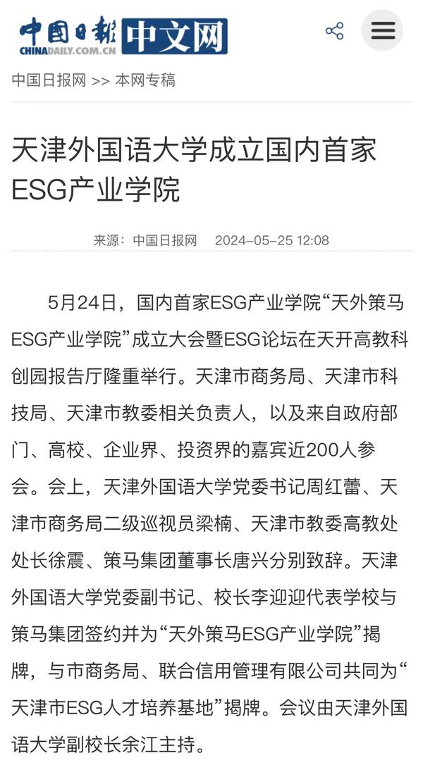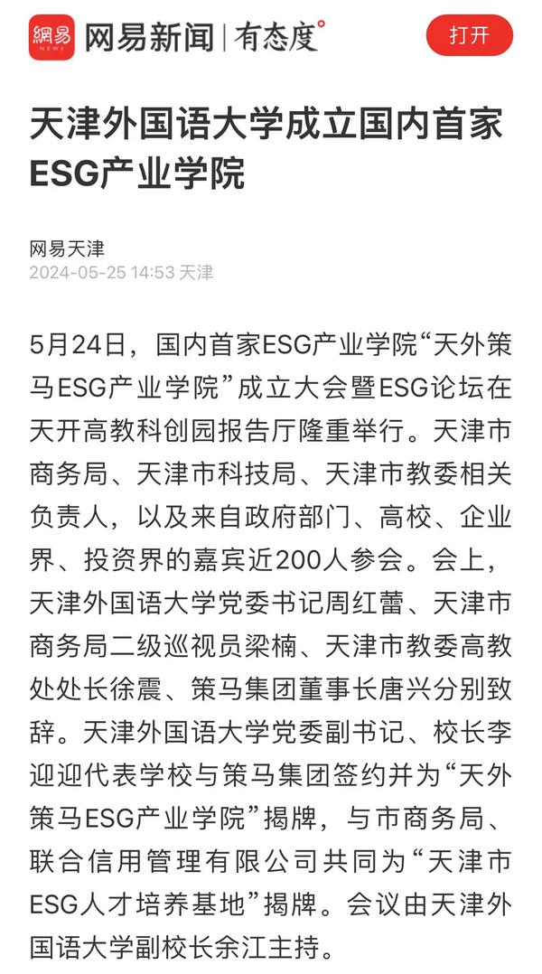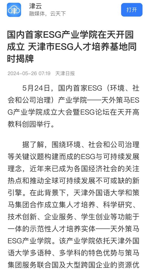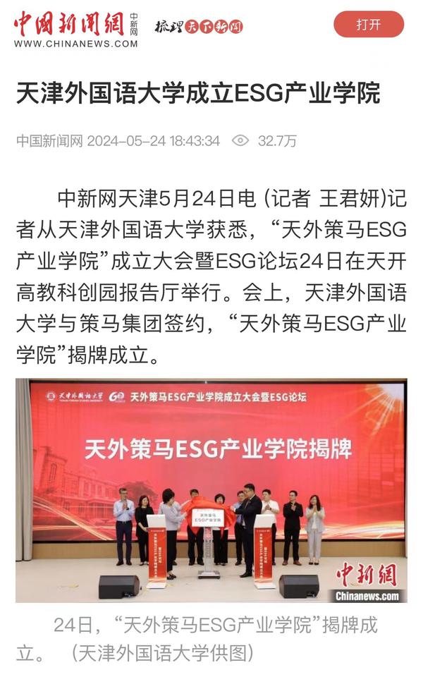 5月24日,国内首家ESG产业学院“天外策马ESG产业学院”成立大会暨ESG论坛在天开高教科创园报告厅隆重举行。该产业学院依托开云手机平台_开云(中国)多语种多学科特色优势与策马集团服务联合国及大型跨国企业的资源优势,构建全方位、全链条、深融合的产学研用协同育人新机制,培养具有ESG知识与实务技能的跨学科、跨领域、复合型的国际化ESG人才。人民日报客户端、人民网、新华社客户端、光明日报客户端、光明日报微信公众号、中国新闻网、中国日报网、央广网、天津日报、津云、天津教育报、网易新闻、北青网等多家媒体对此进行了报道。