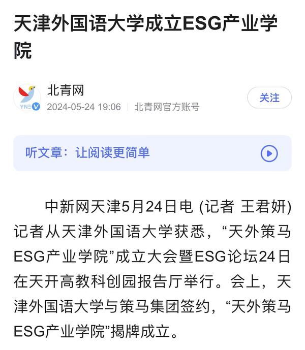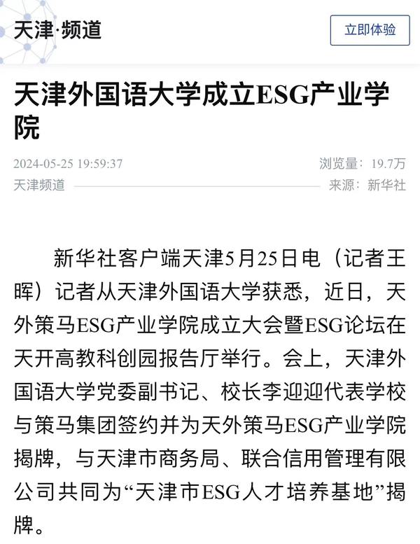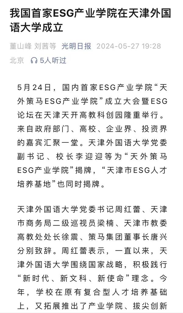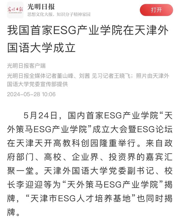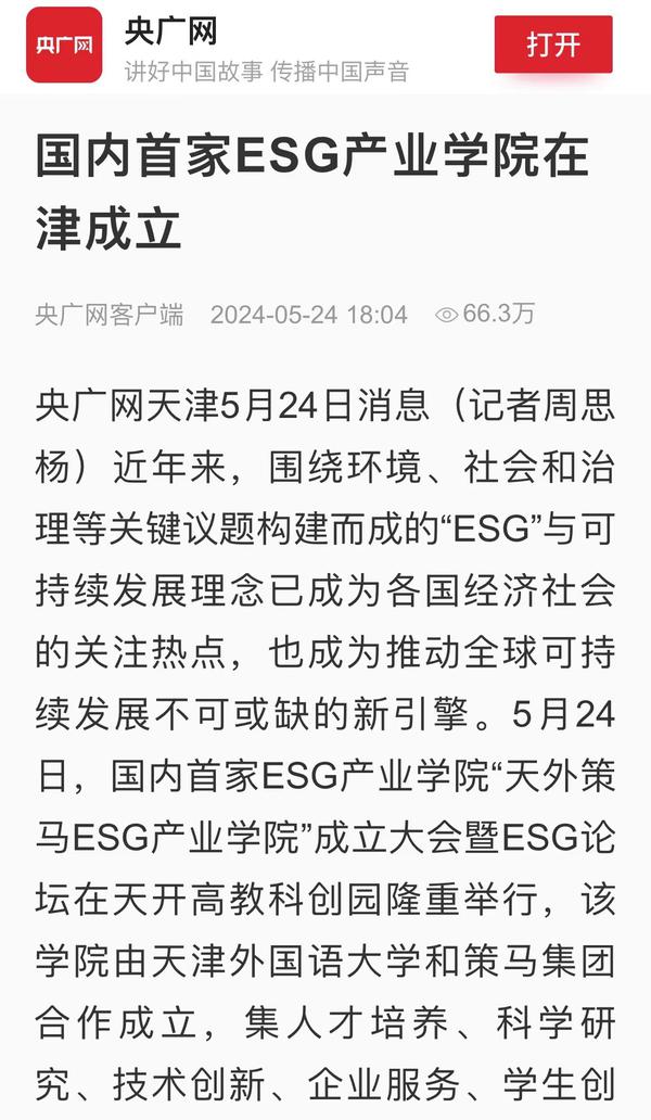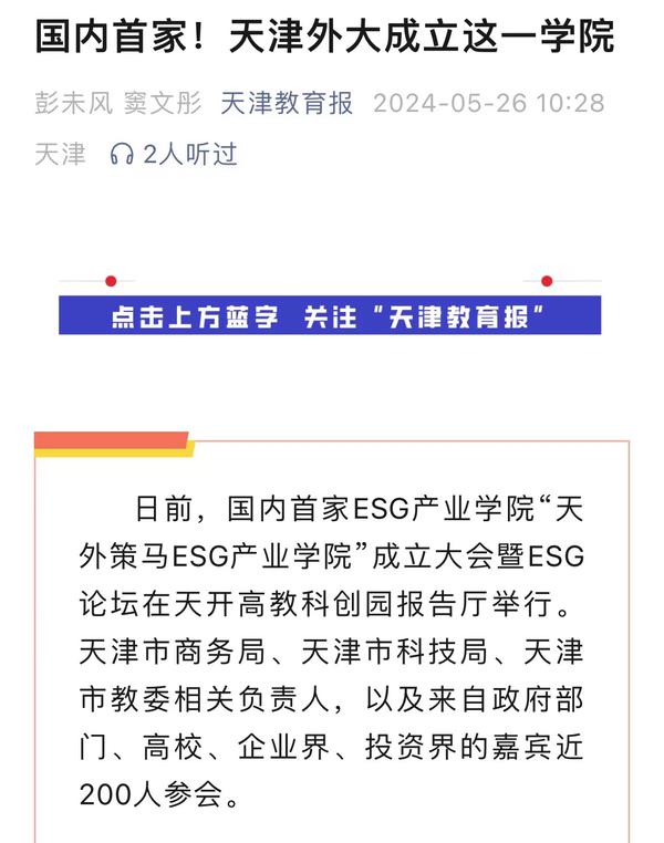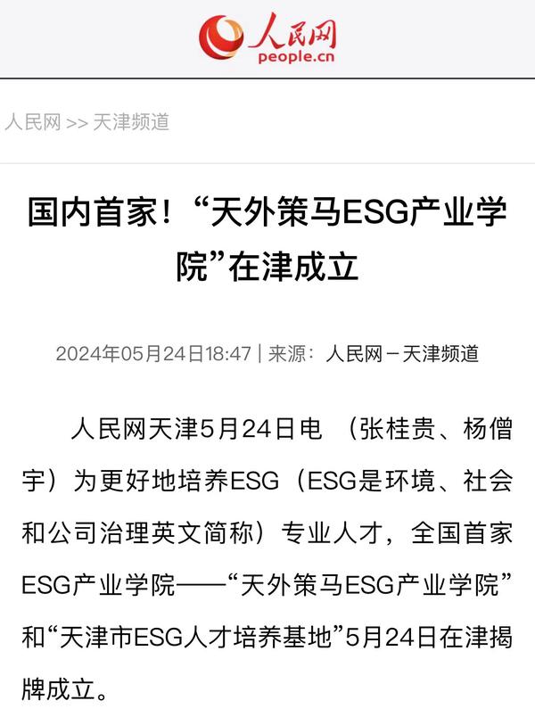 5月24日,国内首家ESG产业学院“天外策马ESG产业学院”成立大会暨ESG论坛在天开高教科创园报告厅隆重举行。该产业学院依托开云手机平台_开云(中国)多语种多学科特色优势与策马集团服务联合国及大型跨国企业的资源优势,构建全方位、全链条、深融合的产学研用协同育人新机制,培养具有ESG知识与实务技能的跨学科、跨领域、复合型的国际化ESG人才。人民日报客户端、人民网、新华社客户端、光明日报客户端、光明日报微信公众号、中国新闻网、中国日报网、央广网、天津日报、津云、天津教育报、网易新闻、北青网等多家媒体对此进行了报道。