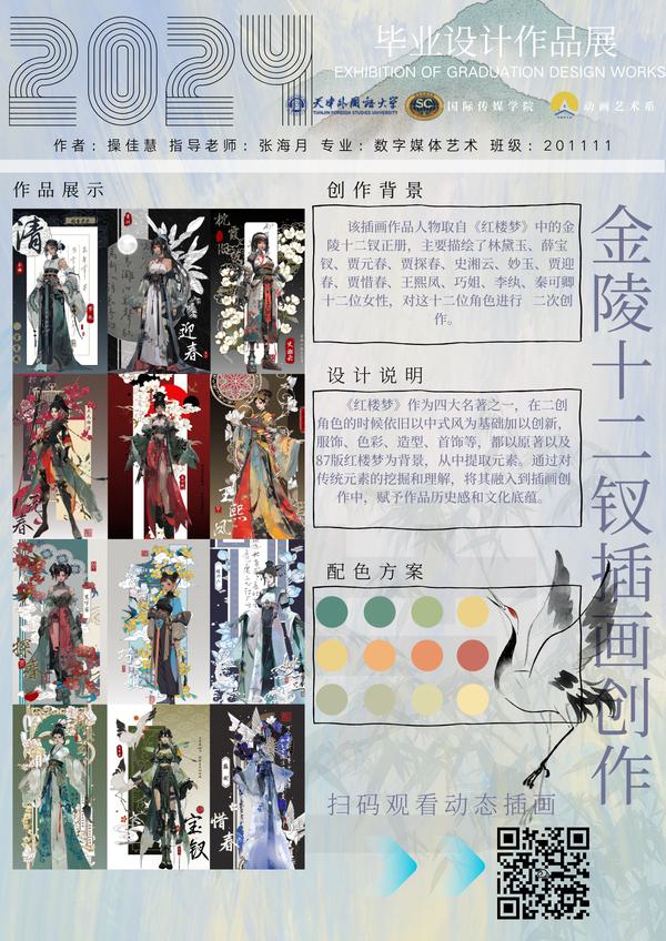 作品简介:插画主题是《红楼梦》中的“金陵十二钗”正册,主要描绘了林黛玉、薛宝钗、贾元春、贾探春、史湘云、妙玉、贾迎春、贾惜春、王熙凤、巧姐、李纨、秦可卿十二位女性,对这十二位角色进行了二度创作。