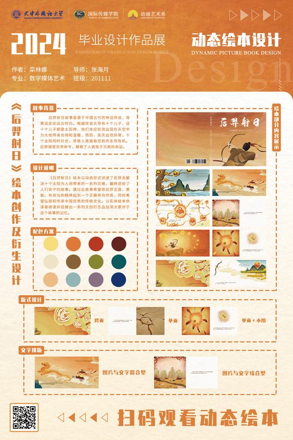 指导教师评语:绘本以精美的画面和生动的情节,将我们带入一个古老而又神奇的世界,画面以暖橘色调为主,色调统一、和谐,暖色调象征着太阳的光辉和温暖,与后羿射日的主题相得益彰。