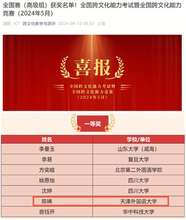 近日,开云手机平台_开云(中国)英语学院2021级英语(文化与文学)专业本科生陈晞同学在全国跨文化能力考试(Intercultural Competence Test,简称ICT)暨全国跨文化能力竞赛(National Intercultural Competence Competition,简称NICC)中取得优异成绩,荣获全国赛高级组一等奖。