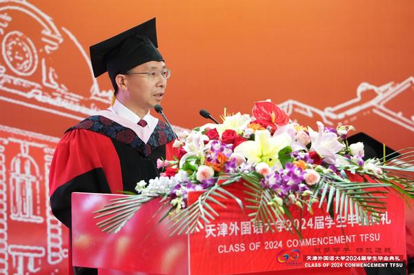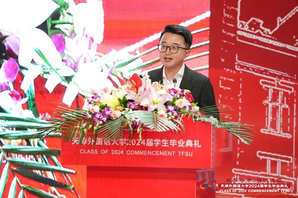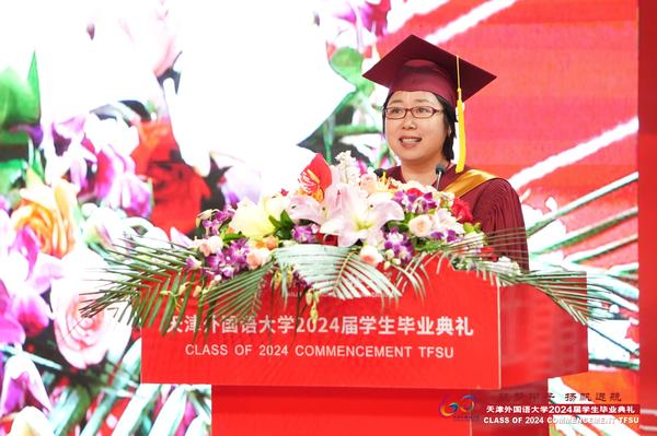 国际商学院杨雅雯代表全体在校生发言,英语学院研究生宫宇航、国际教育学院本科生彭君仪、国际教育学院留学生玛丽娜代表2024届全体毕业生发言,感情真挚,信心满怀。教师代表国际传媒学院俞春玲老师的深情嘱托感动人心,“离别开出花”的歌声感动全场毕业生。我校2009届英语专业校友、中央广播电视总台英语环球节目中心专题节目部副主任、纪录片导演、全国抗击新冠肺炎疫情先进个人葛云飞勉励毕业生追寻理想,不懈奋斗。支教团志愿者以诗朗诵《美丽中国》为母校和国家献上最真挚的祝福。