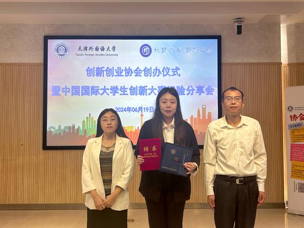 2022级俄语口译专业学生龚栎霖作为第一届会长,宣读《高级翻译学院创新创业协会章程》并发表感言,对关心和支持协会成立的学院领导、老师们表示诚挚感谢,并对创新创业协会未来工作提出规划。王瑾、常晓宏共同为协会首届会长龚栎霖颁发聘书和纪念品。