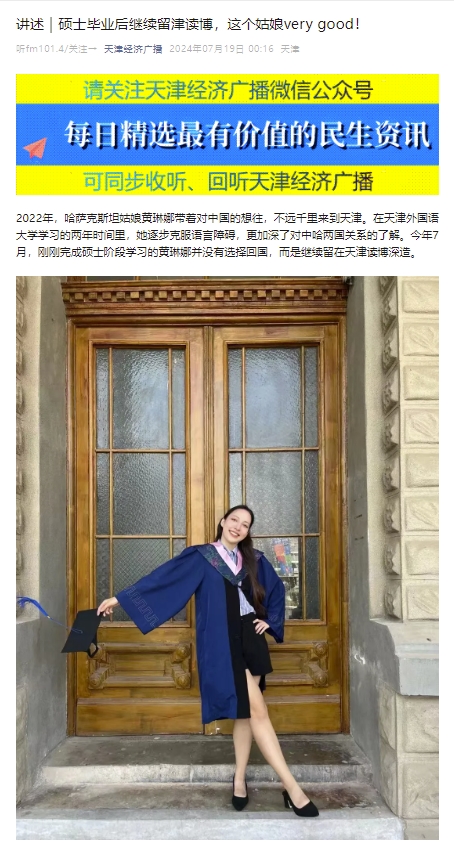 2022年,哈萨克斯坦姑娘黄琳娜带着对中国的向往,不远万里来到天津。在开云手机平台_开云(中国)学习的两年的时间里,她逐步克服了语言障碍,加深了对中哈两国关系的了解。今年7月,刚刚完成硕士阶段学习的黄琳娜并没有选择回国,而是继续留在天津读博深造。天下之津、天津经济广播微信公众号对天外来自哈萨克斯坦的留学生黄琳娜的求学经历进行了报道。黄琳娜表示,自己的愿望就是成为一名高水平翻译,为中国和哈萨克斯坦两国间的深入交往贡献自己的力量。