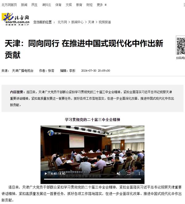 连日来,天津广大党员干部群众紧扣学习贯彻党的二十届三中全会精神,紧扣全面落实习近平总书记视察天津重要讲话精神,紧扣高质量发展这一首要任务,抓好各项工作落地落实,在进一步全面深化改革、推进中国式现代化中作出新贡献。