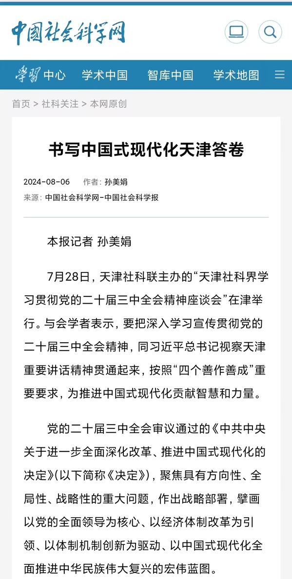 党的二十届三中全会开启了新征程上推进中国式现代化的时代新篇,学习好贯彻好党的二十届三中全会精神,是当前和今后一个时期的一项重大政治任务。日前,天津社科界学习贯彻党的二十届三中全会精神座谈会在天津市社会科学界联合会召开。与会专家学者结合天津实际,深入交流加强学习宣传、研究阐释党的二十届三中全会精神的思路和建议。