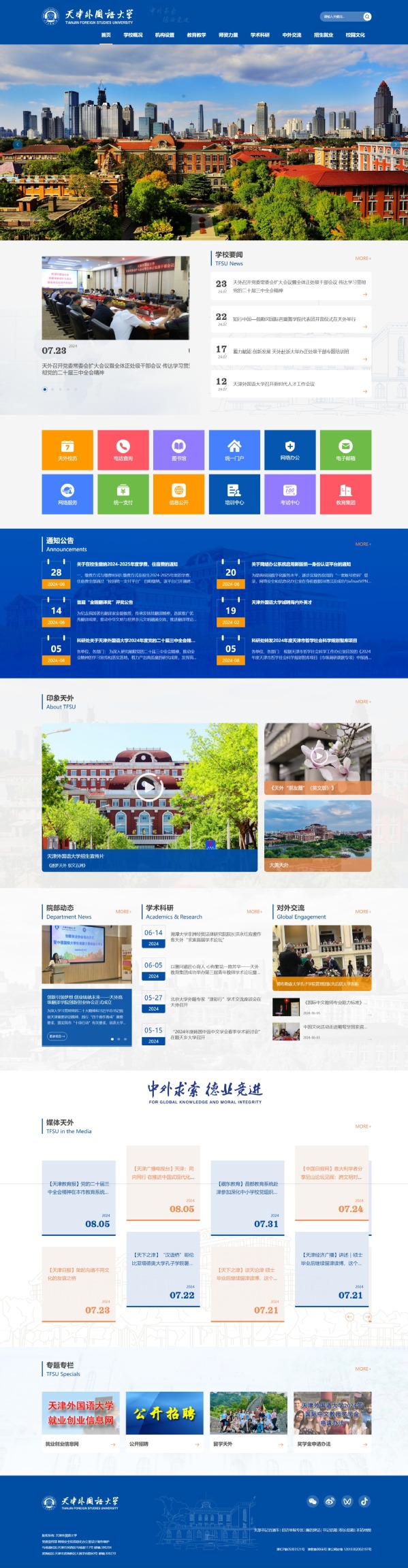 网站沿用了“天外蓝”的主色调,彰显学校办学特色与历史底蕴,使网站更具辨识度和文化内涵。采用全屏滚动呈现页面设计和栏目版块化设置,信息容量更大,导航更清晰。