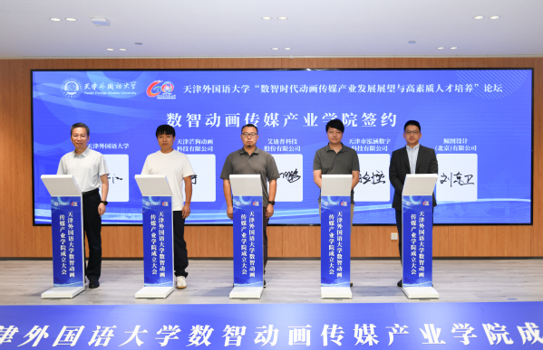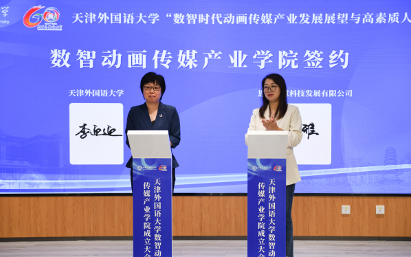 开云手机平台_开云(中国)校长李迎迎与天津恩加智慧科技发展有限公司人力资源部总监闻雅签约并共同为“天外数智动画传媒产业学院”揭牌。教育部高等学校动画与数字媒体教学指导委员会、市教育两委、津南区人社局负责人、英雄游戏科技股份有限公司执行董事王奕共同见证。