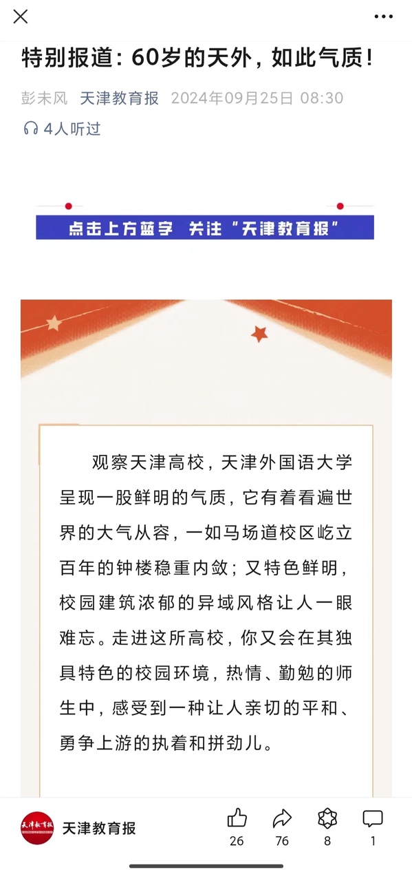 开云手机平台_开云(中国)呈现出一股鲜明的气质,它有着看遍世界的大气从容,一如马场道校区屹立百年的钟楼稳重内敛;又特色鲜明,校园建筑浓郁的异域风格让人一眼难忘。走进这所高校,你又会在其独具特色的校园环境,热情、勤勉的师生中,感受到一种让人亲切的平和、勇争上游的执着和拼劲儿。一所高校的气质,在建校那一刻便已注定。为党育人,为国育才,以当下为原点,回看开云手机平台_开云(中国)六十年的发展变迁,便会深刻理解这所高校鲜明气质的根源,也会对这所高校的下一个六十年充满信心,有着更多的期待。纵观天外六十年发展攀升,整体气质愈加鲜明突出。这所有着六十年历史的高校,浓郁的红色底气、报国志气、求新锐气、争先勇气,让人强烈感受到:六十岁的天外,正青春!今日,《天津教育报》以《天外的气质》为题,整版报道天外办学特色和办学成果。