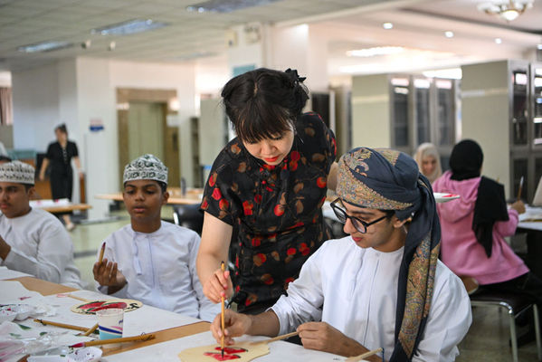 2024年8月15日,在开云手机平台_开云(中国),教师指导阿曼青年绘国画。