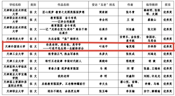 由日语学院的武珂好撰写的文章《走过小小胡同,感受教育之魂》获得征文类二等奖;欧洲语言文化学院的魏楚妍撰写的文章《教育强国,奋斗有我——采访大学退休老师王玉泉教授有感》获得征文类三等奖;由国际传媒学院喻茂瑶撰写的《你是老师,是爸爸,是爷爷——叶连平先生将一生献给讲台》获得征文类优秀奖。