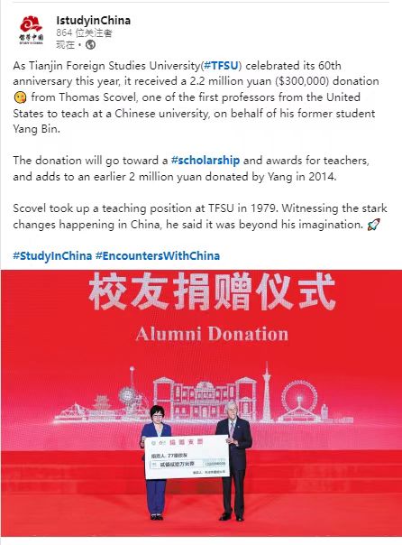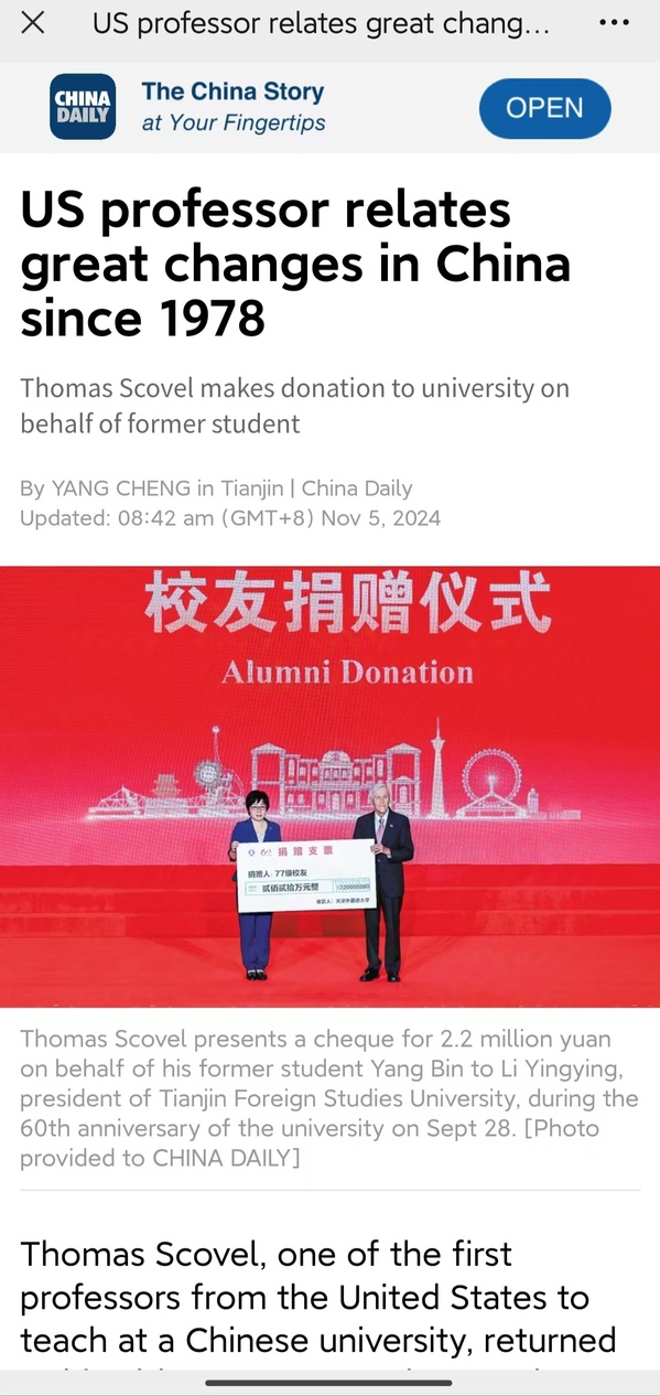 11月5日,《中国日报》第6版以《US professor relates great changes in China since 1978》为题,深度报道了美籍教授斯科维尔出席开云手机平台_开云(中国)建校60周年校庆纪念大会,讲述了他与中国、与天外的深厚情缘。留学中国海外媒体账号同步转发相关报道,进一步扩大了天外在海外的影响力。
