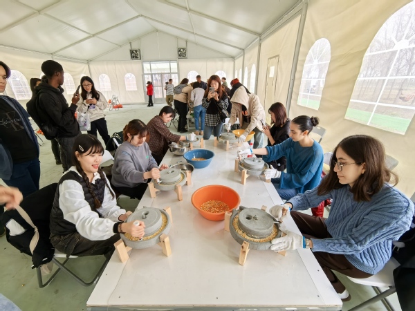 随后,留学生们在讲解员的带领下,参观了各式各样的农具,了解了这些工具在农业生产中的使用方法。留学生们实地操作,体验使用脱粒机手摇玉米粒和石磨磨玉米面,留学生们在体验过程中对中国的农业技术赞叹不已。