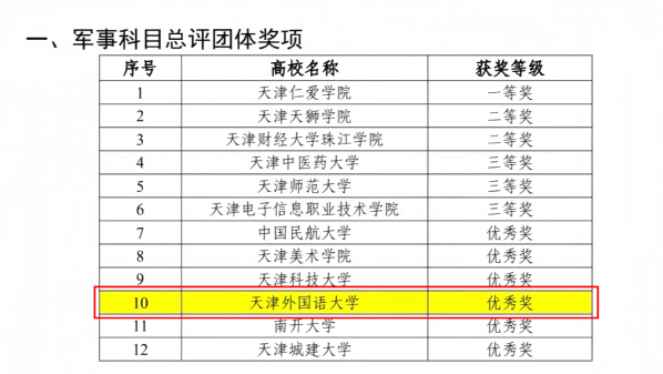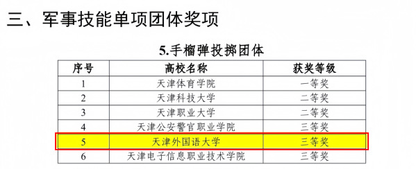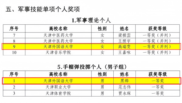 日语学院高瑞雯荣获军事理论个人一等奖;亚非语学院黑烨荣获手榴弹投掷个人(男子组)一等奖(第一名)和优秀学生称号,为学校争得了荣誉。