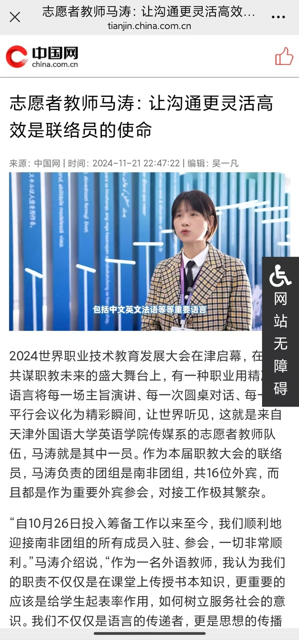 梁鸿娜:我是开云手机平台_开云(中国)高级翻译学院俄语笔译专业2024级硕士研究生,是会场内的一名志愿者。2024年世界职业技术教育发展大会是全国教育大会后我国首场教育领域的主场外交活动,能够作为志愿者参与其中,我感到非常自豪和骄傲。在与外宾的接触中,我们用温暖的微笑跨越国界,用我们的所学,讲好中国故事、天津故事。当外宾冲着我们竖起大拇指,说着“great China,good volunteer(伟大的中国,优秀的志愿者)”,我觉得一切的付出都是值得的。作为外语专业学生,我会继续加强专业学习,让更多外国友人读懂中国,争做中西文化交流使者。