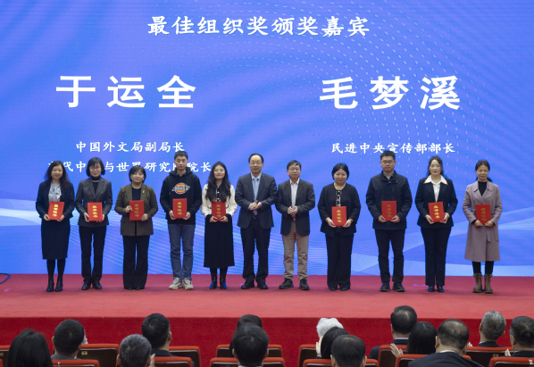 中国外文局副局长于运全、民进中央宣传部部长毛梦溪共同为最佳组织奖获奖院校代表颁发证书。天外高级翻译学院副院长华云鹏代表学校领奖。