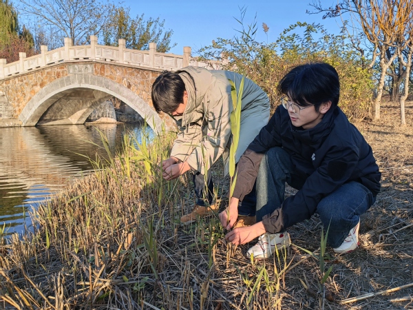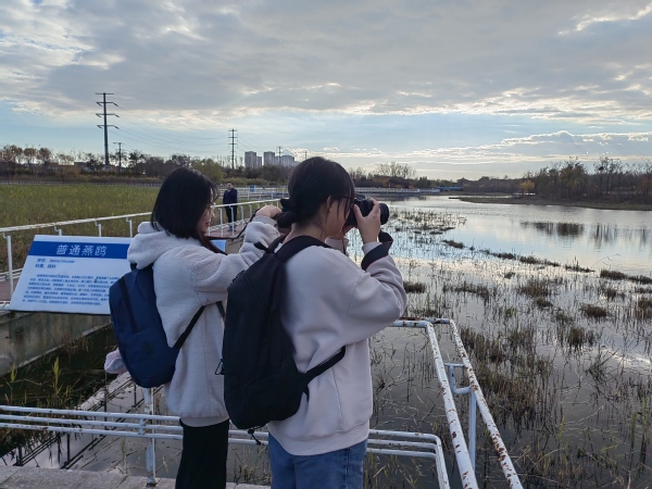 走进临港公园,“水荡沽田”“蜿蜒蒲香”“芦荡飞雪”“长田鹭飞”等八大特色景观一一在师生面前精彩呈现。听着来自天津市生态环境科学研究院刘红磊博士的专业讲解,师生们一路走、一路看、一路实践。