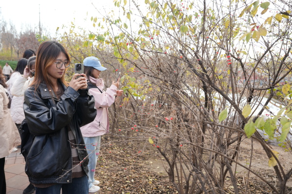 精彩的互动环节吸引了师生们的广泛参与,他们有的在湿地湖边采集水样,有的收集芦苇研究净水原理,有的挖掘土壤了解土质,有的驻足拍摄候鸟栖息觅食的有趣场景,有的尝试辨识身边各类植物,大家在“沉浸式”的思政课教学中真切感悟美丽中国建设的天津生动实践。在公园的科普中心,声光电融合的世界让这堂“绿色”思政课瞬间变得更加生动有趣。