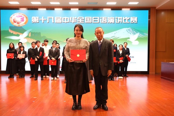 大连大学原副校长宋协毅教授、日本国驻华大使馆次田亚美女士为特等奖获奖者颁奖